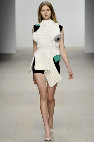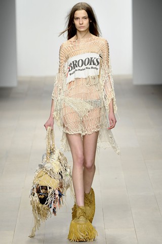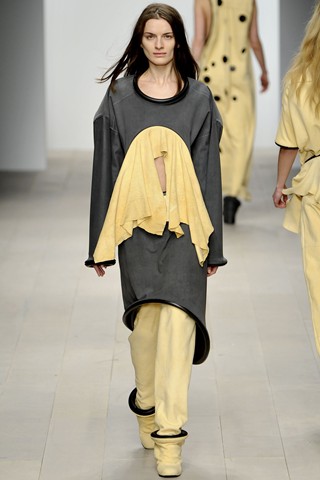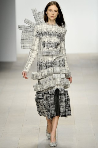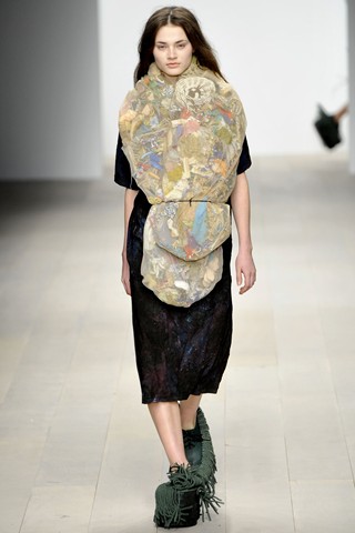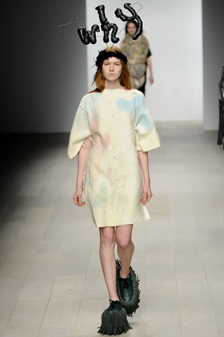 If I could foresee the trend from graduate shows, I would say the fashion future wouldn’t be fresh but bright. The opening collection by Luke Brooks, winner of the L’Oréal Professionnel Creative Award, brought out models wearing “paints” – the new scrap object that piles up paints to make fabric, joined little pieces of leftover yarn to a baggy-bag scarf and used paper marché for accessories.