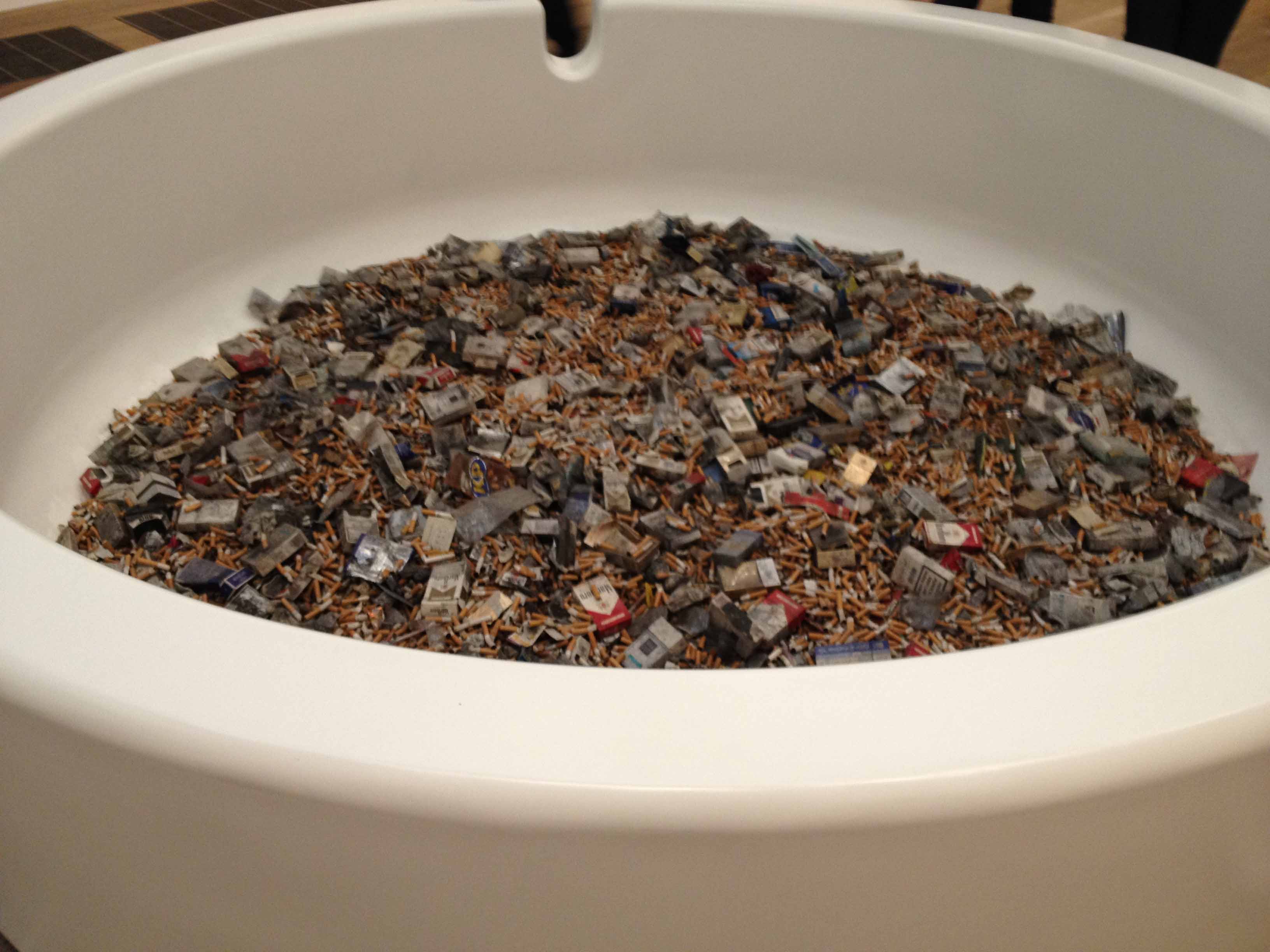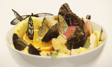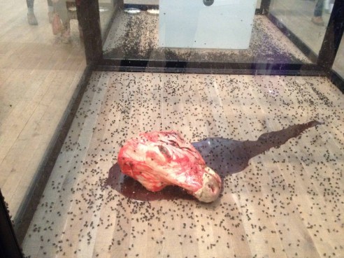The most striking pieces, to me, are A Thousand Year 1990 and In and Out of Love. They are shocking examples for the contradiction of life and death, and a display of life process. The flies sucking blood from the dead cow head and the butterflies gorging fruit juice share the same destiny – death. When you look at the fragile butterflies, often wounded, flapping aimlessly in the room of spectacle, their lives are downplayed to merely an exhibit for visitors.  You can’t help thinking how short life can be – in this case, it’s less than 4 months of exhibition time. (In fact it’s much shorter, which are brought to the room every day by the supplier).