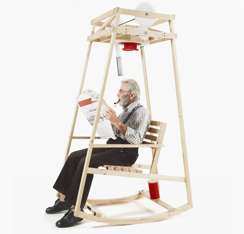 Oncle Sam machine focuses on the transformation from corn to popcorn and celebrates each one in grandiose fashion. Rocking knit is a rocking chair equipped with gears to knit hats. Stamp creates a production line that converts plastic trellis into lamp through heating and shaping.