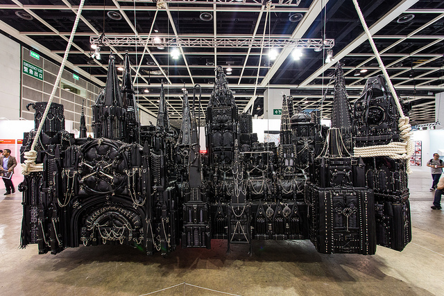 “Play – (201301)” by Chinese art group Madein Company is a suspended sculpture shaped like a Gothic cathedral, but with accessories that reference BDSM such as leather, latex and chains. The whole piece is suspended using the Japanese erotic bondage technique Kinbaku. It’s crash of religion and sexual desire.